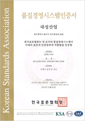 | 품질경영시스템 ISO9001 인증서 발행처 : 한국표준협회 |