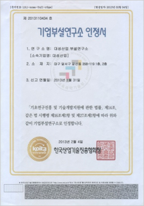 기업부설연구소 인증서 발행처 : 한국산업기술진흥협회 |