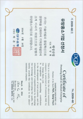 유망중소기업 선정서 발행처 : 대구은행 |