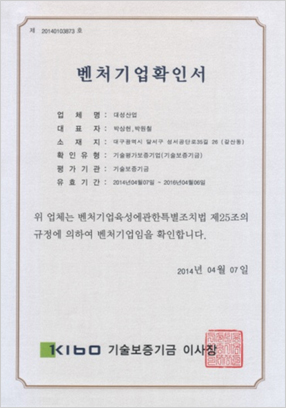 | 벤처기업확인서서 발행처 : 대구은행 |