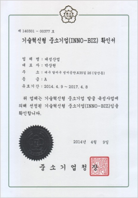 | 기술혁신형 중소기업 확인서 발행처 : 중소기업청 |