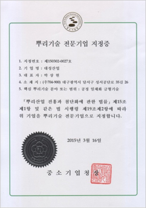 뿌리기술 전문기업 지정증 발행처 : 중소기업청 |